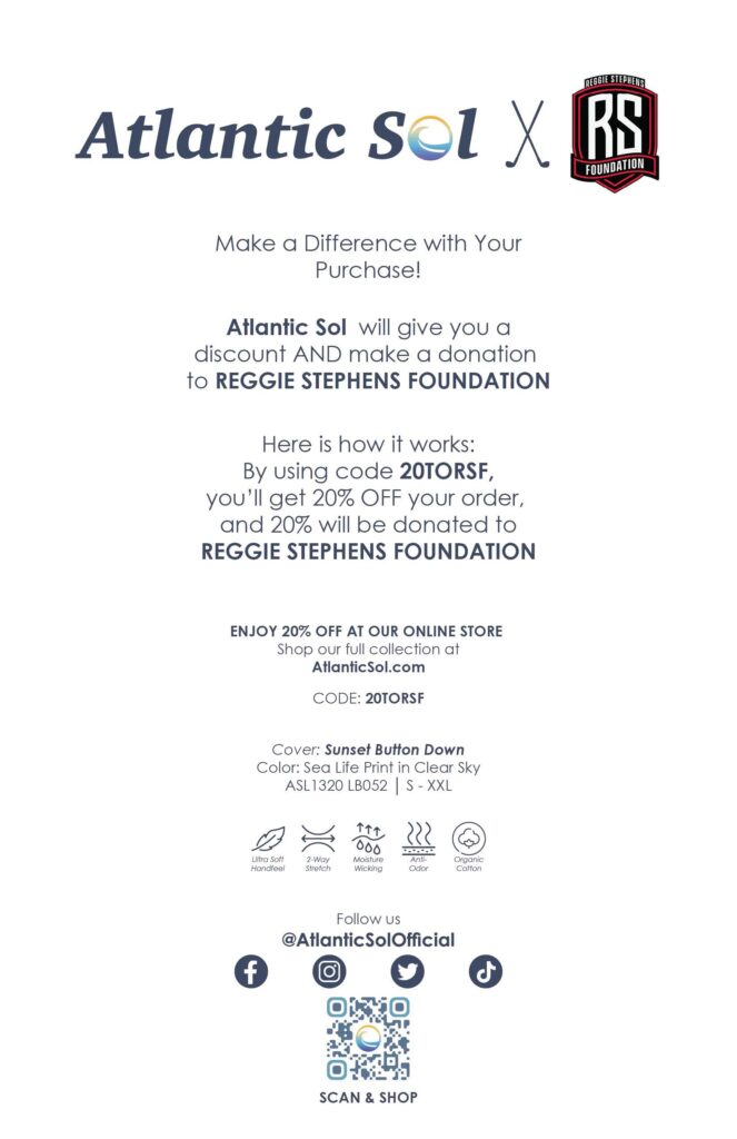 We’re proud to partner with Atlantic Sol as an official corporate sponsor of the Reggie Stephens Foundation (RSF)! When you shop at AtlanticSol.com (https://www.atlanticsol.com) and use the code 20TORSF at checkout, you’ll receive 20% off your order, and 20% of your purchase will be donated directly to RSF.