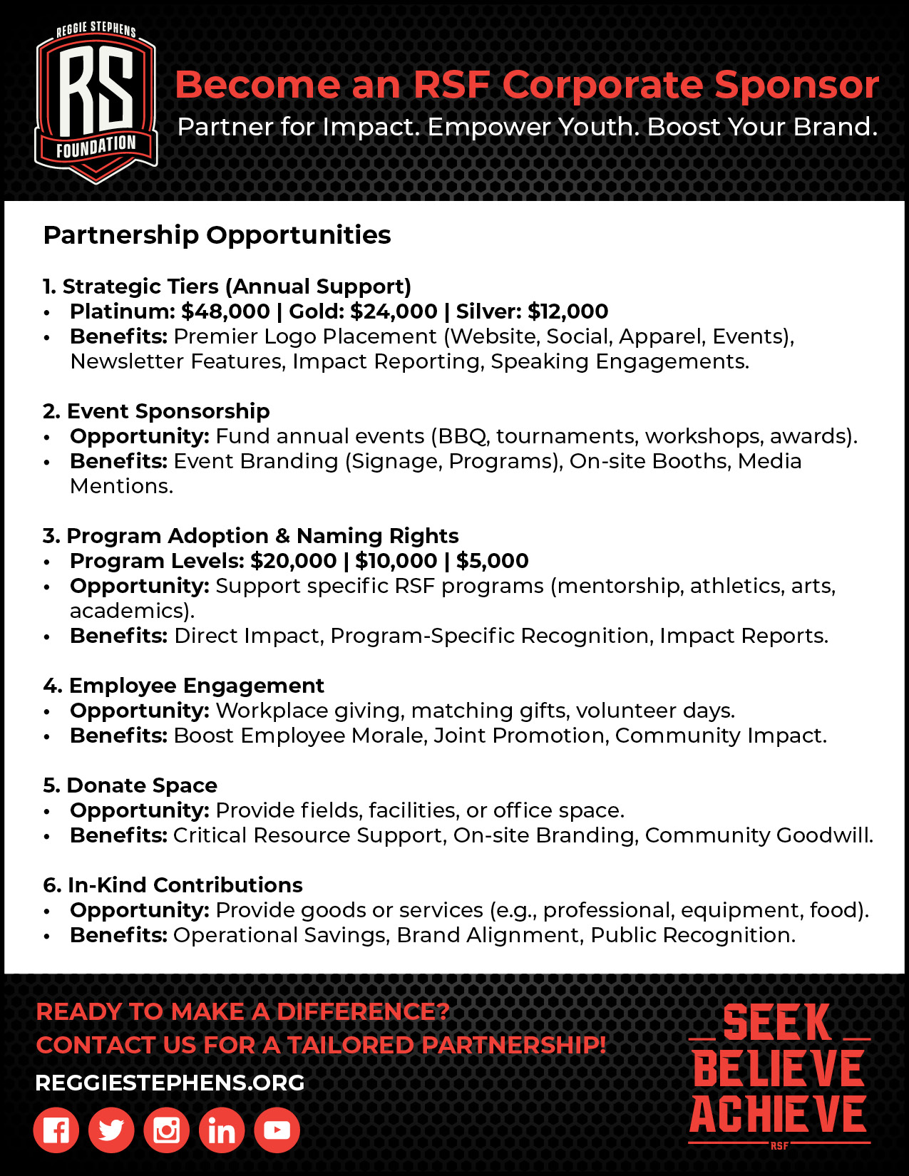 Partner with RSF and align your brand with a powerful mission. When you become a Corporate Sponsor, your company doesn’t just provide resources; you become an integral part of transforming lives and empowering the next generation. Your investment directly fuels our programs, provides essential resources, and helps us expand our reach, creating tangible and measurable outcomes in the areas that need it most.