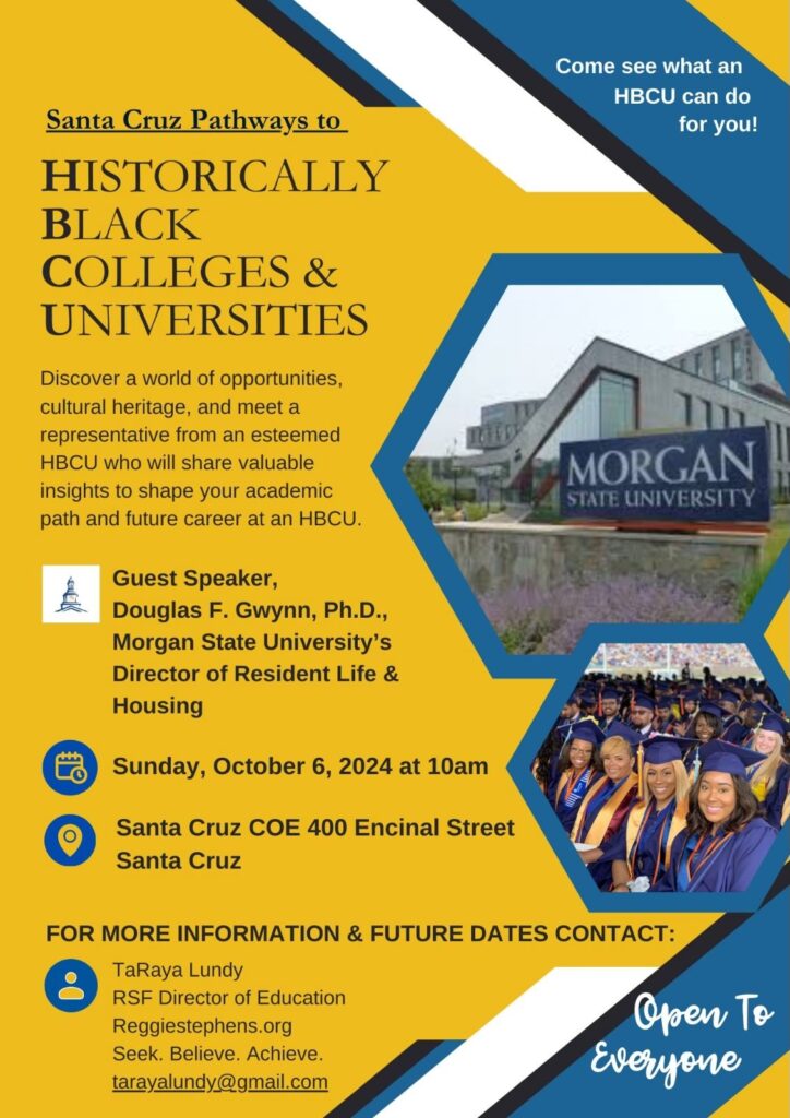 The Reggie Stephens Foundation (RSF), in collaboration with Morgan State University and Black Health Matters Santa Cruz, organized presentations in Santa Cruz County to provide youth with insights into Historically Black Colleges and Universities (HBCUs). On Sunday, October 6th, Dr. Douglas F. Gwynn, Morgan State’s Director of Resident Life & Housing, along with RSF’s Education Director, Taraya Lundy, led a presentation at the Santa Cruz County Office of Education. This event educated students about cultural and academic opportunities at HBCUs, with the support of Black Health Matters Santa Cruz.