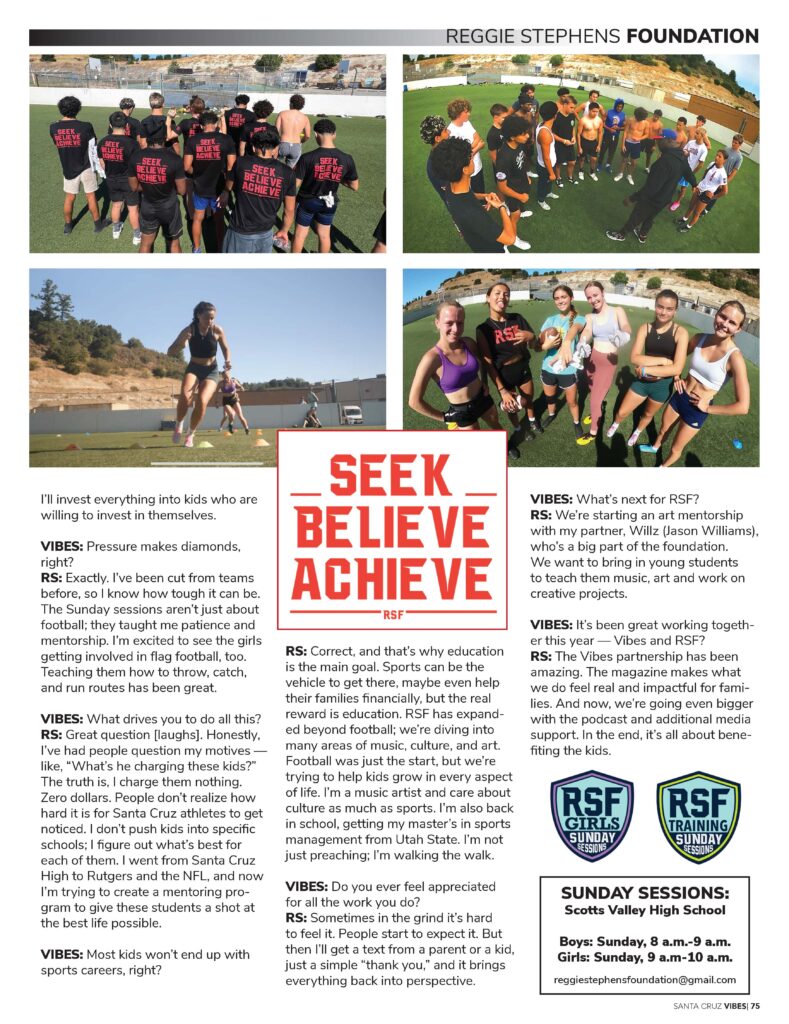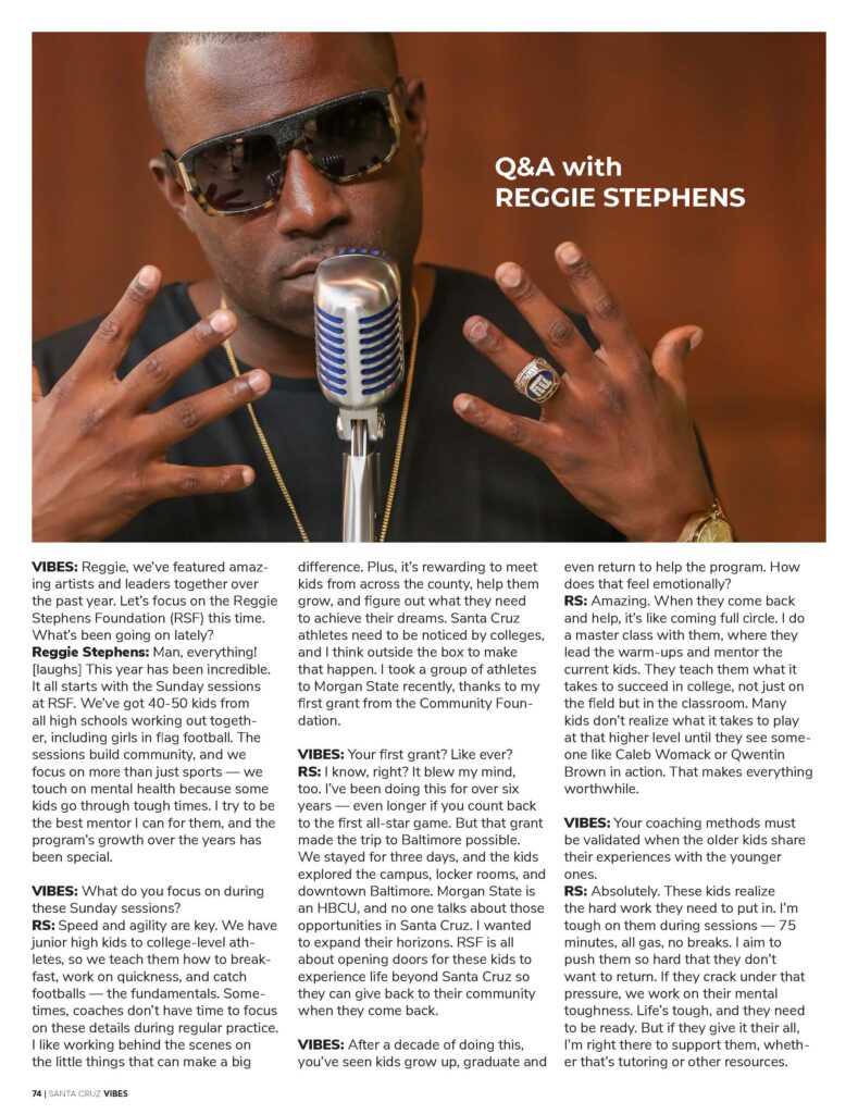 Sep152024RSF ArtsRSF CultureRSF InternationalRSF MusicRSF SportsQ&A with Reggie Stephens Categories: RSF Arts, RSF Culture, RSF International, RSF Music, RSF SportsBy adminSeptember 15, 2024 Author: admin https://rsf7staging.digitalwavedesign.com Post navigationPreviousPrevious post:RSF Sunday Sessions: Training for Girls’ Flag FootballNextNext post:RSF Partners with Morgan State University HBCU to give Santa Cruz youth educational & cultural opportunitiesRelated PostsSanta Cruz County Office of Education Features Reggie Stephens on Youth Empowerment & Community ImpactApril 9, 2026More Than a Game: RSF Central Coast All-Star Game Inspires the Next GenerationMarch 31, 2026Golden State Storm Support for Womens Coaching Alliance Play it Forward EventOctober 18, 2025Reggie Stephens named one of Good Times Trailblazers: 50 Santa Cruzans Who Shaped Our CountyAugust 28, 2025Reggie Stephens Joins Golden State Storm Board of AdvisorsAugust 4, 2025Reggie Stephens – Mexico City Press Run | Black Man in Mexico & The Collective RootJuly 28, 2025